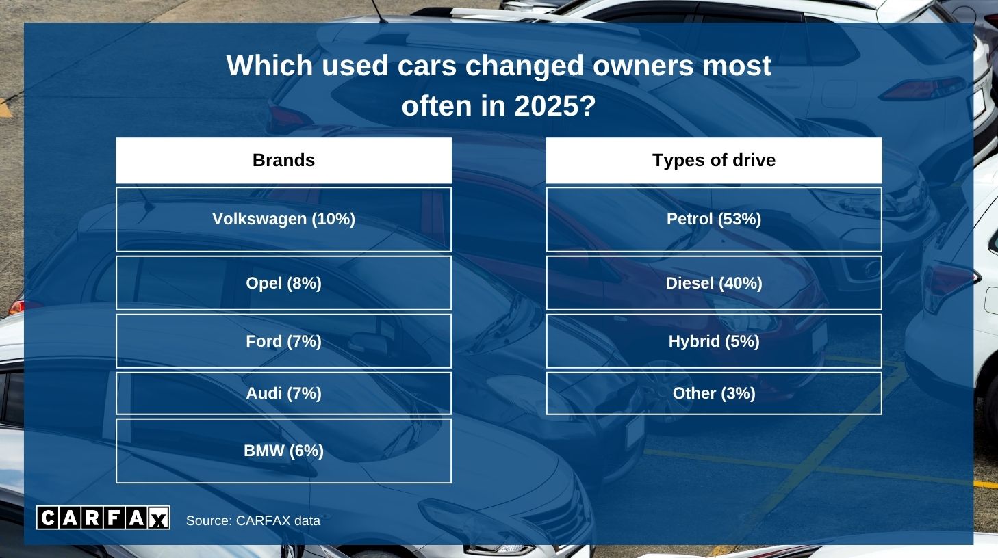 One in 10 used cars purchased on the Polish secondary market last year was a Volkswagen, according to an analysis of CARFAX, a company that provides users with used car history reports from reliable and certified sources. Opel cars came second in terms of popularity, accounting for 8% of cars that changed hands in 2025. Ford came in third (7%). The next two places belong to premium brands – Audi (7%) and BMW (6%). In total, according to available data, approximately 3.5 million cars were sold on the Polish secondary market in 2025.